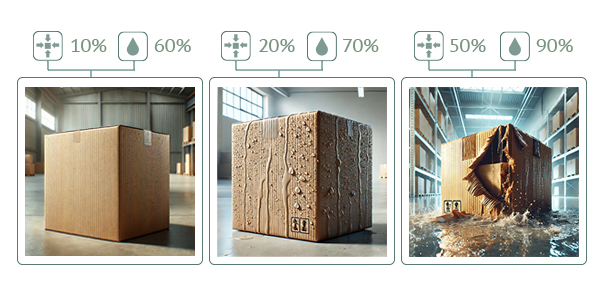 La humedad relativa afecta significativamente la resistencia de las cajas corrugadas. A medida que aumenta la humedad relativa, el material de las cajas pierde rigidez debido a la absorción de humedad por las fibras de papel. La humedad alta o constante, hace que las pérdidas pueden superar el 50% de su resistencia original.