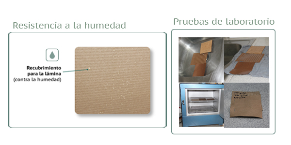 El cartón debe resistir la humedad relativa en almacenes y transporte marítimo. Se pueden aplicar recubrimientos hidrofóbicos o tratamientos con ceras biodegradables.