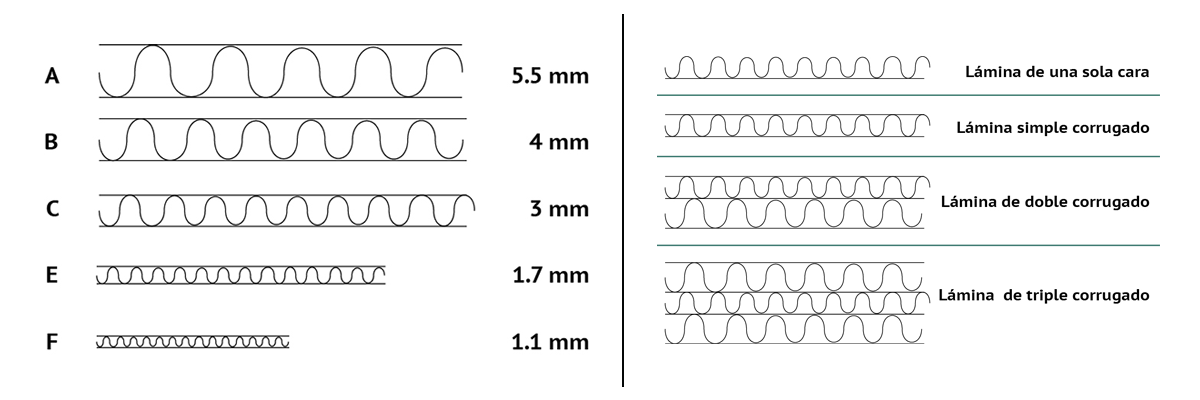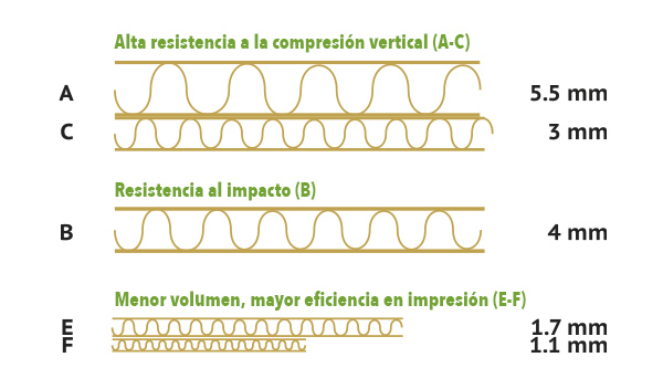 El tipo de flauta (A, B, C, E, F) define las propiedades de resistencia y amortiguación. Por ejemplo, las flautas más grandes ofrecen mayor resistencia a la compresión vertical, mientras que las más pequeñas proporcionan mejor calidad para impresión y estructuras compactas.